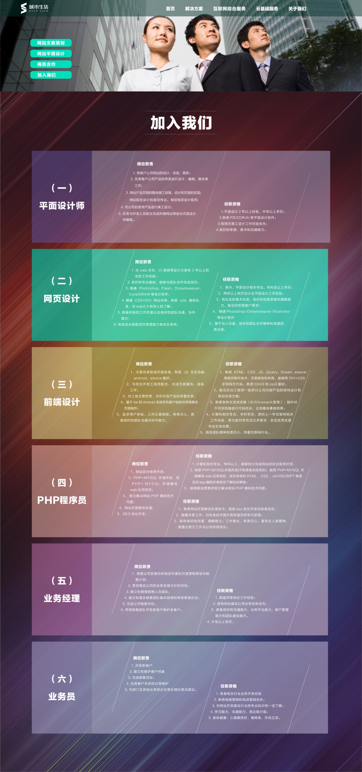 阜阳城市生活网络技术有限公司成立于 2013年,是一家向客户提供高端网站建设服务及品牌网络营销服务的专业化综合网络服务企业。公司专注于企业网站开发建设与网络运营推广,提供网站设计、网页制作、网络推广、网站优化、统开发、微信开发、移动互联网应用开发等一站式立体服务,同时提供企业邮局、域名注册、虚拟主机、办公家具、通信业务、商标注册等相关周边配套业务。公司以客户利益为出发点,以市场需求为准绳,以服务网络营销为目的,以网站建设和网络运营为手段,为客户规划定制符合企业需求、带有营销价值和品牌推广能力的网络建站方案,提供从网站前期调研、需求分析、网站定位分析、网站策划、技术架构,到网站界面设计、创意表现、站点架构搭建、网站文案策划、后续数据采集、监控维护、网站优化、网站运营反馈建议等一系列高价值服务。